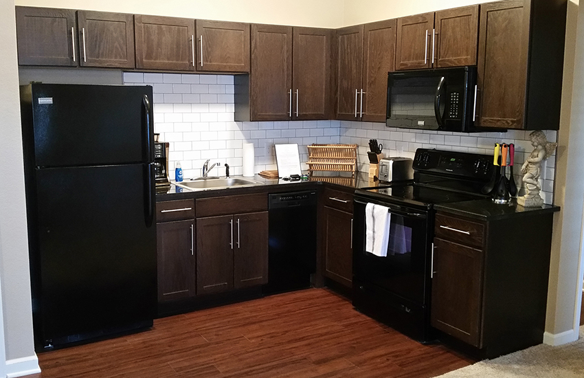 Spacious kitchens with refrigerator, electric range, microwave, and dishwasher.